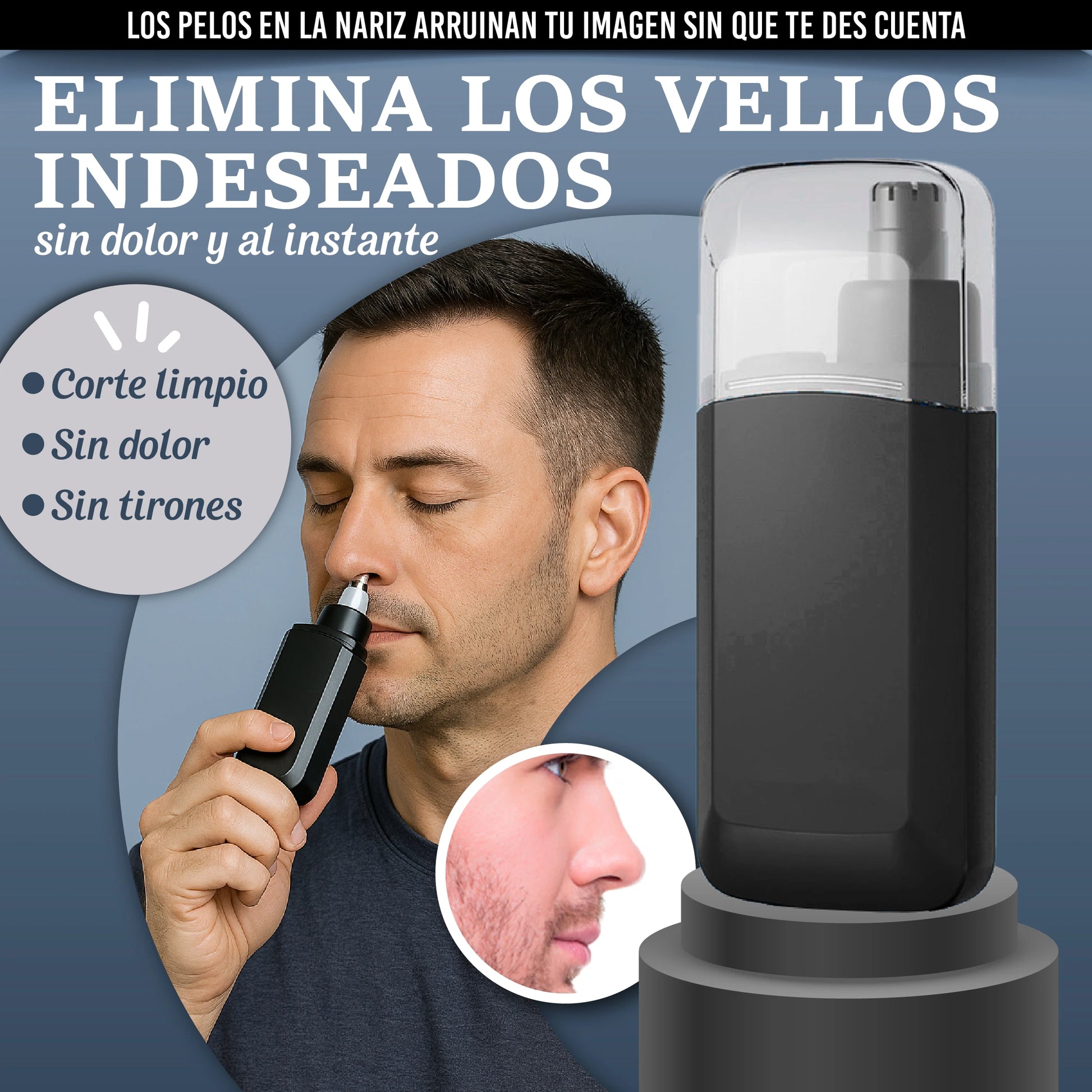 Su sistema de corte de alta precisión elimina los pelos sin tirones ni molestias. Dile adiós a las pinzas y al ardor.